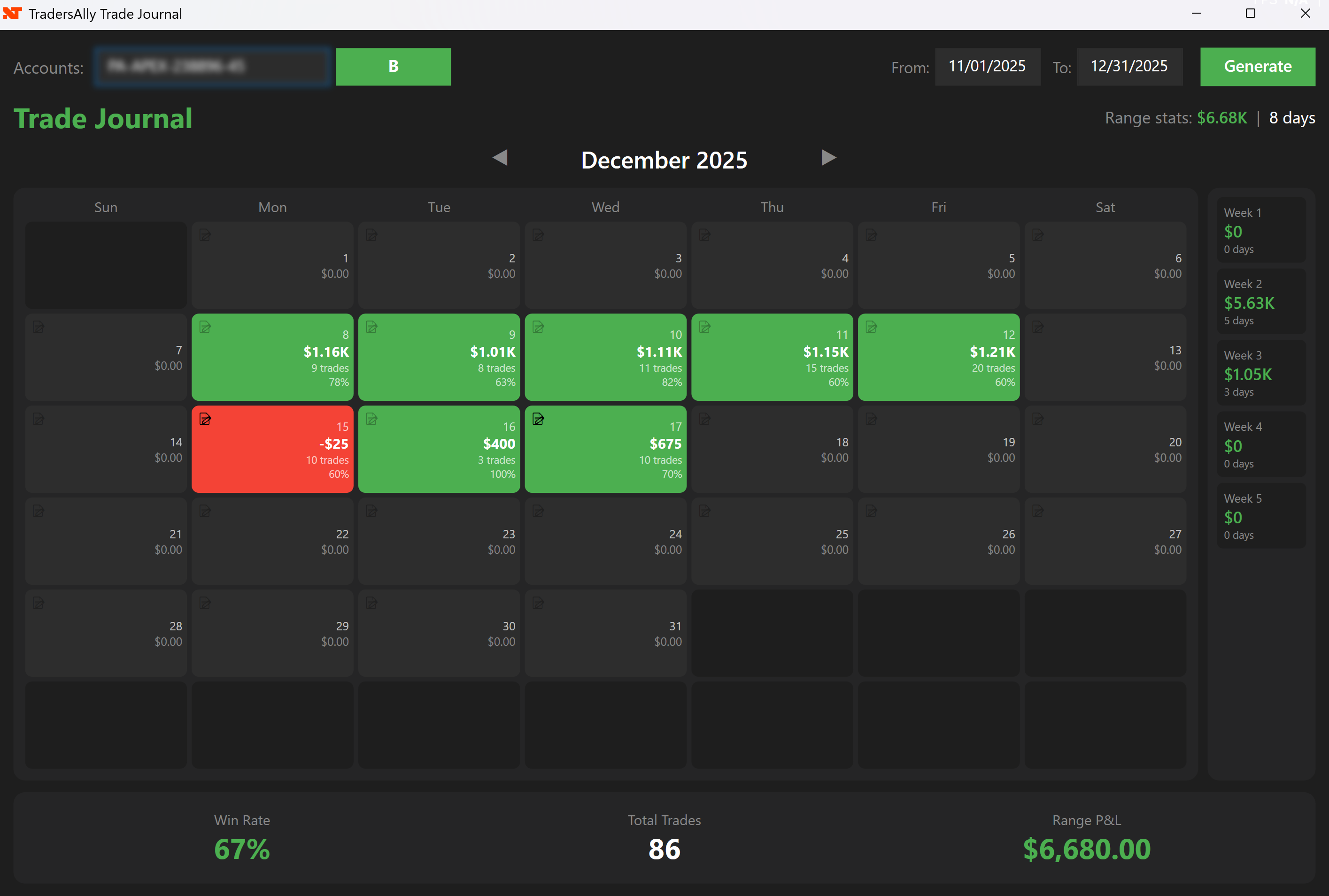The goal of this trade journal for NinjaTrader is to provide quick, actionable feedback. The top panel displays your essential monthly trade journal statistics—including Win Rate, Total Trades, and Net P&L—giving you a clear target to beat each month. Seeing a streak of green days on your calendar serves as powerful positive reinforcement, while spotting red clusters helps you recognize when you might be tilting or deviating from your plan.