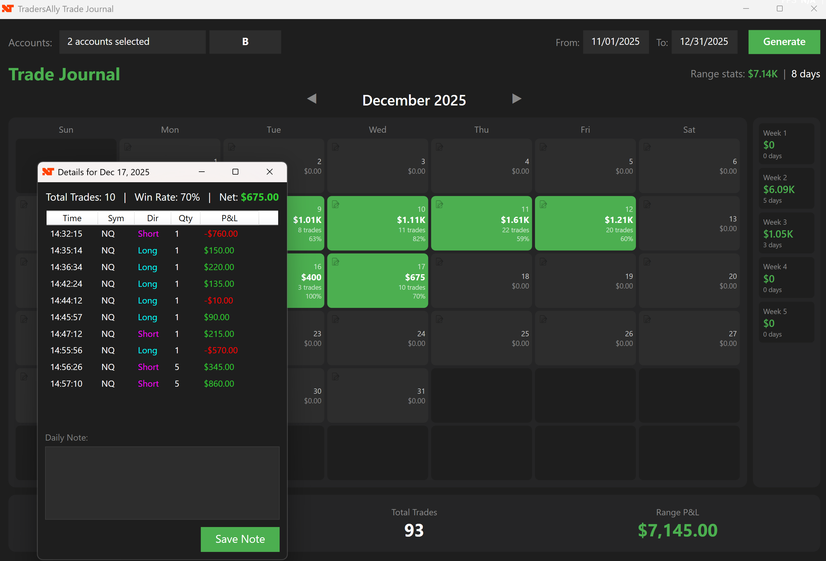 Daily Details: Clickable days show individual trade direction, quantity, and time.